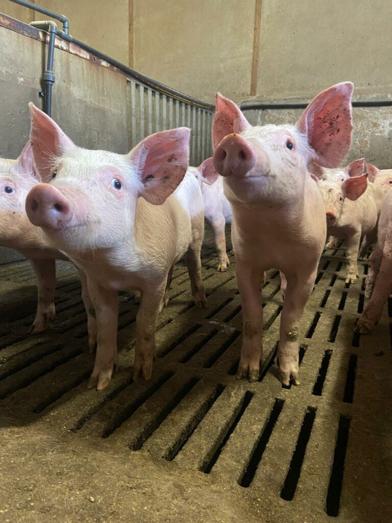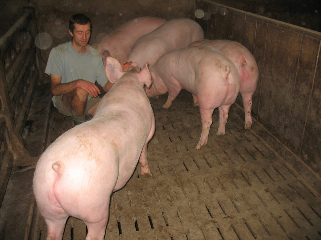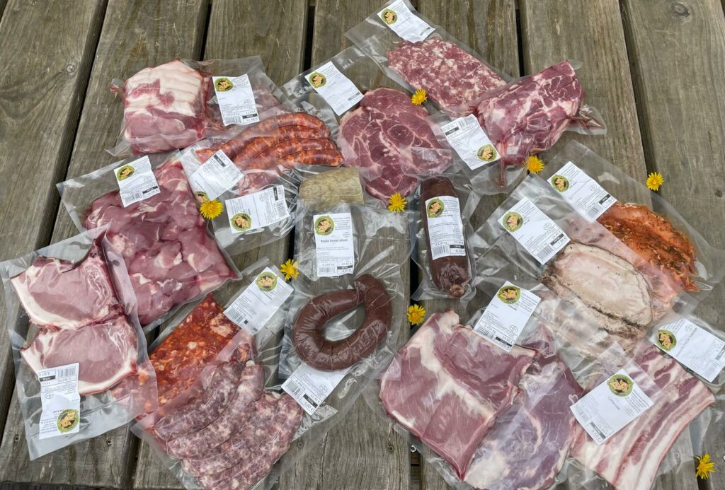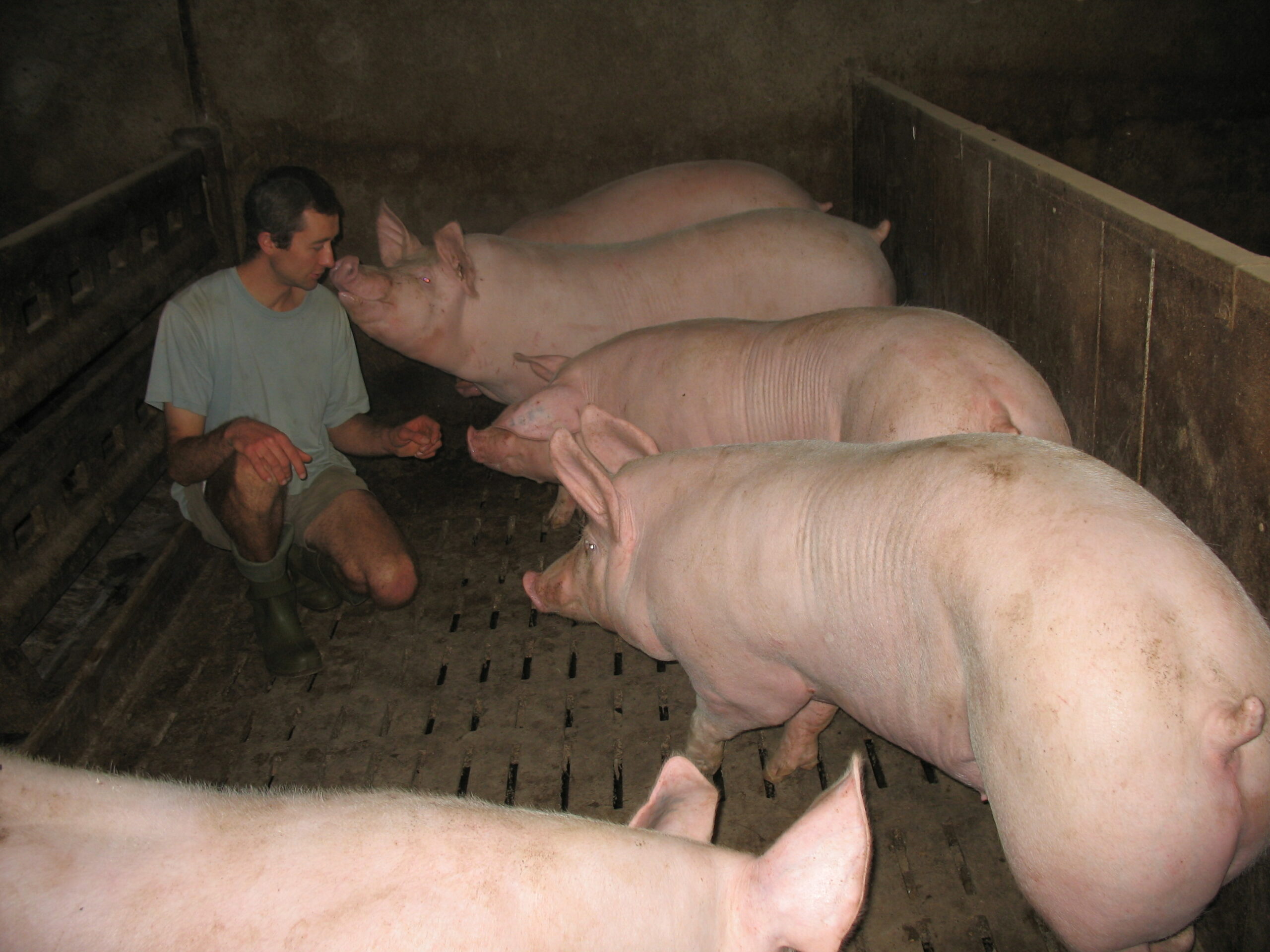 Les porcs, soigneusement sélectionnés, sont nés et élevés sur place. De race LargeWhite x Piétrain, nous vous proposons des porcs lourds de 200kg environ, approchant 1 an d’âge, tels que ceux qui étaient historiquement élevés dans toutes les fermes, meilleur gage d’une viande savoureuse car aboutie.